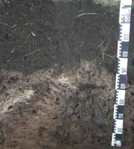 Bildunterschrift: Kipp-Kohlelehmsand mit Aschemelioration unter Wald im Untersuchungsgebiet Domsdorf/Tröbitz